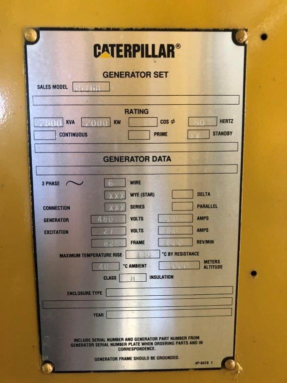 Good Used CAT 3516B Generator Set; 2000 Model - 364 Hours Since New; 2000kW Standby Rated; 480/277V; Sound Attenuated Enclosure; Ready to Ship!
