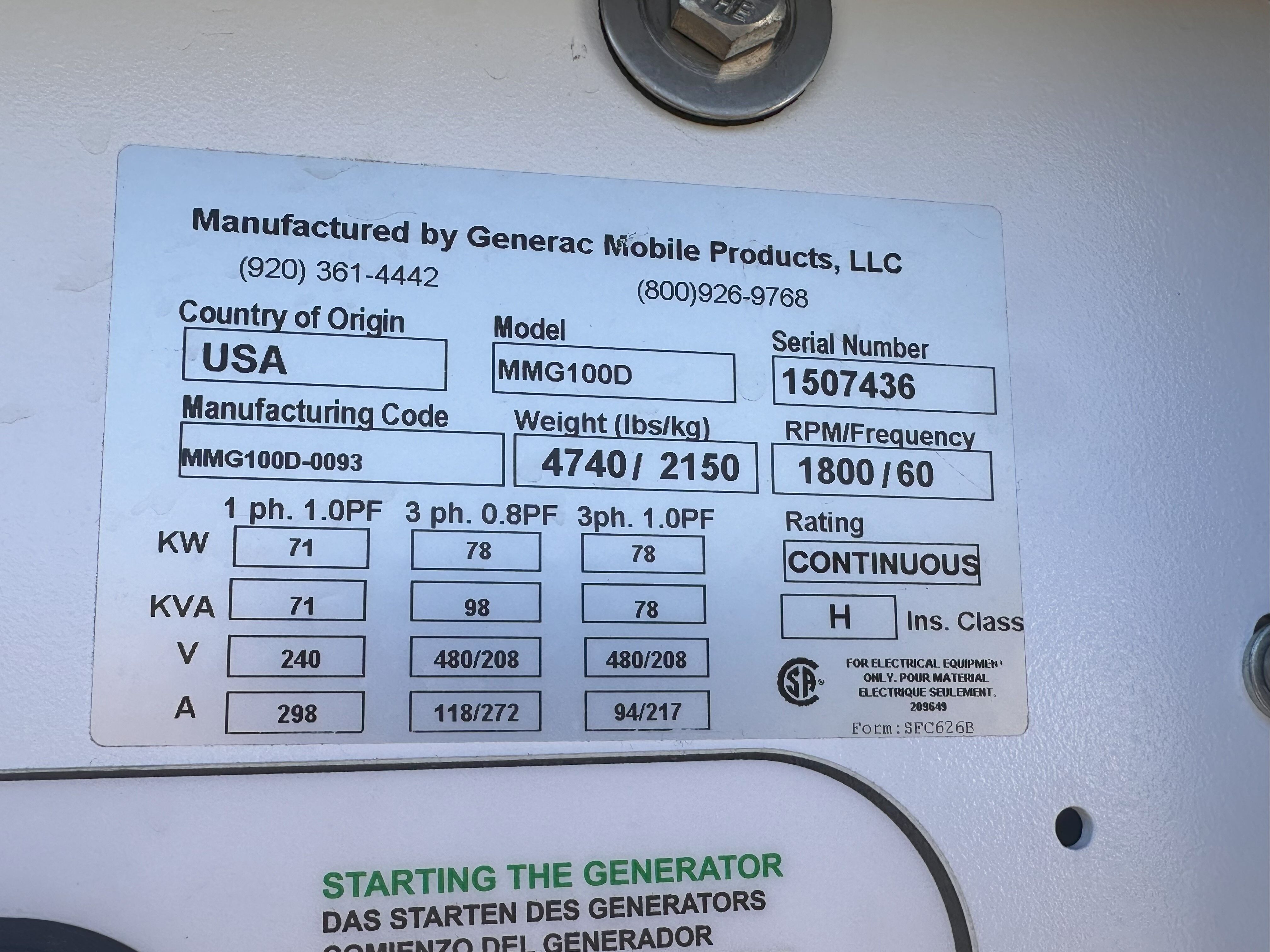 Used Generac MMG100D Generator Set