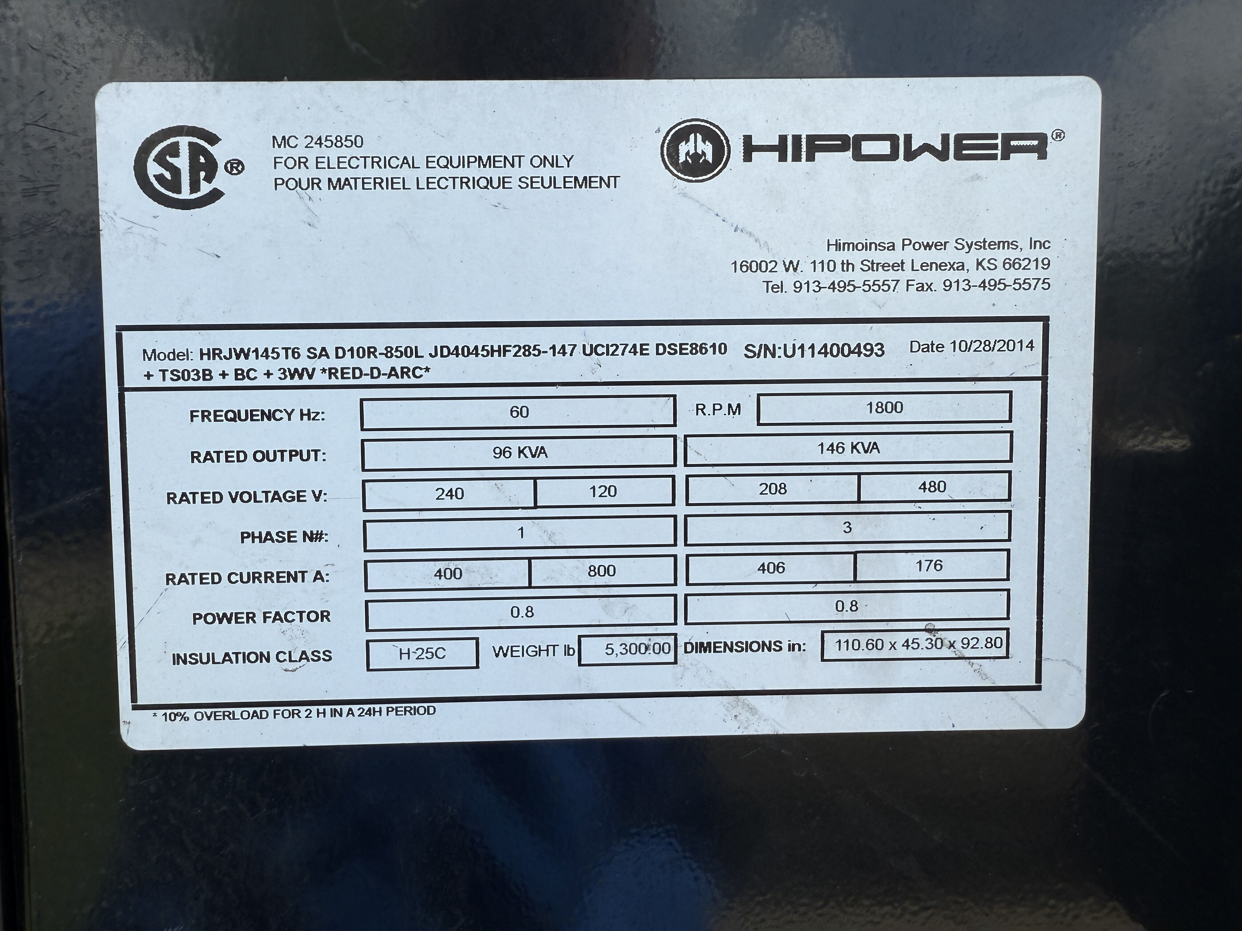 Used HiPower HRJW145 Generator Set