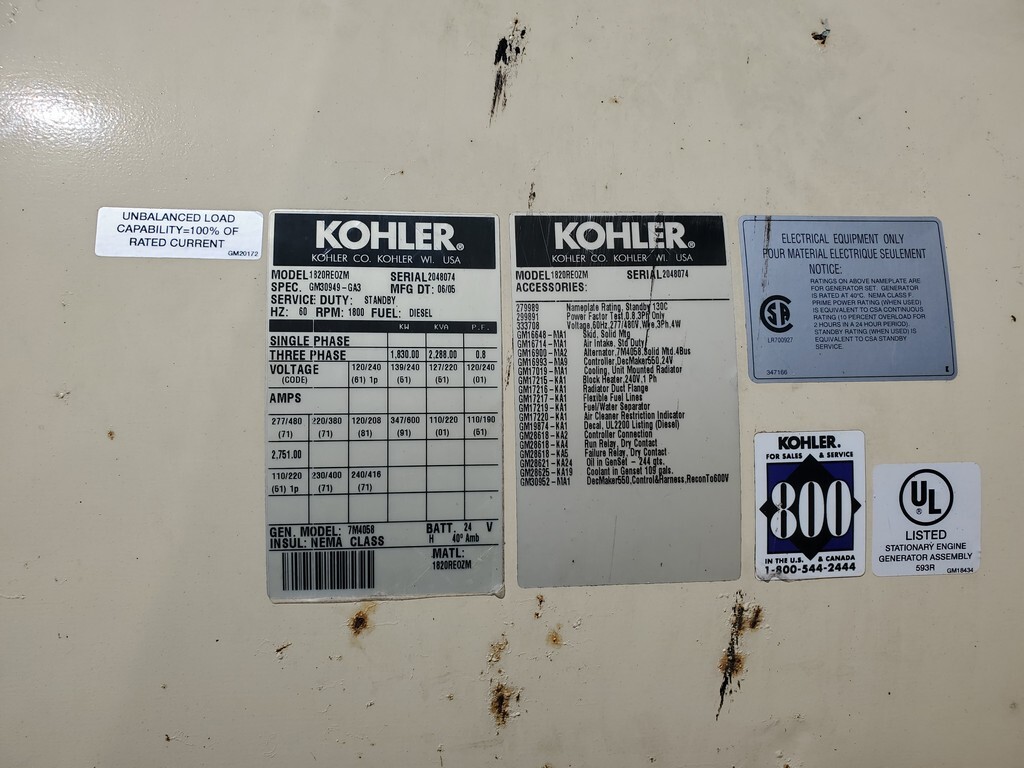 Good Used Kohler 1820 Generator Set; 2005 Model - 858 Hours Since New; 1820kW Standby Rated; 480/277V; Weather Enclosure; 3000 Gallon Base Fuel Tank; Digital Control Panel; Contact Us Today for More Information!