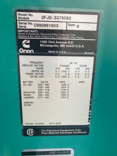 Good Used Cummins KTA38 Generator Set; 1999 Model - 300 Hours Since New; 1000kW Standby Rated; Weather Proof Enclosure; Power Command Control Panel; Well Maintained